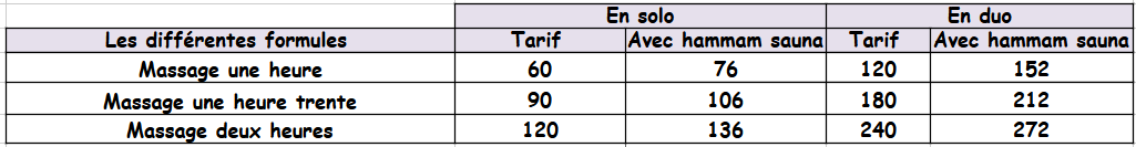 Attention, pour les massages en duo simultané : seulement pour une heure trente ou deux heures.